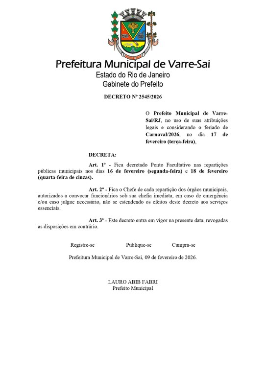 O Presidente da Comissão de Orçamento e Finanças, da Câmara Municipal de Varre-Sai, CONVIDA a todos para assistir presencialmente ou via internet no endereço eletrônico (link disponível no sitio https://www.varresai.rj.leg.br/ ) Aba: TV Legislativa Web, a AUDIÊNCIA PÚBLICA, nesta Comissão que se realizará no dia 23 de fevereiro do corrente ano, às 15 horas, na Câmara Municipal, à Av. José Ramos Vieira, nº 81, referente aos Relatórios da LRF – 3º quadrimestre de 2025, da Prefeitura Municipal de Varre-Sai.